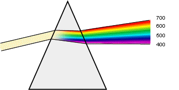 - La lumière blanche se décompose en passant au travers d'un prisme (ou d'une goutte d'eau) comme suit :